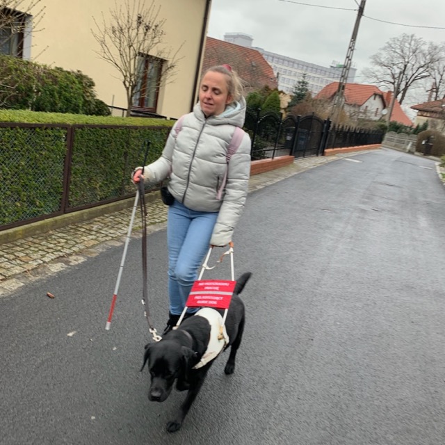 Zaraz po przyjeździe spotkałam się z Emilem, czyli trenerem, i Mochi. Od tego momentu rozpoczęliśmy treningi. Uczyłyśmy się siebie nawzajem. Ja nigdy wcześniej nie miałam do czynienia z psem przewodnikiem, ponieważ straciłam wzrok cztery lata temu. Dzięki temu, że Emil był bardzo cierpliwy, a szkolenie przebiegało w życzliwej i przyjaznej atmosferze, czas spędzony na mrozie i śniegu był przyjemny. Po tygodniowym szkoleniu wróciłam razem z Mochi do domu. Mochi szybko się zadomowiła i zaakceptowała codzienne rytuały. Zaprzyjaźniła się również z naszą starszą sunią, Abi. Obie dziewczyny doskonale się dogadują i nie zauważam między nimi rywalizacji.