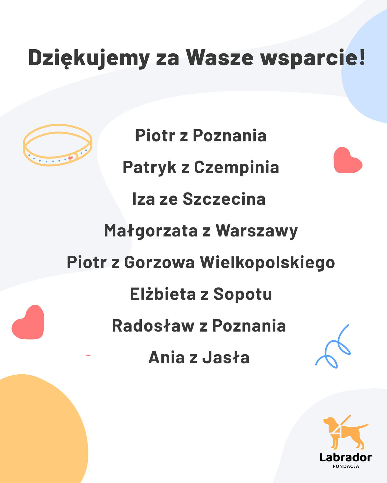 Obserwując nasz profil, wiecie, że działamy bez ustanku – szkolimy psiaki do pracy w roli psów przewodników i psów asystujących, aby w niedalekiej przyszłości mogły stać się wsparciem dla osób z dysfunkcjami wzroku oraz zmagających się z zaburzeniami lękowymi. To wszystko możliwe jest między innymi dzięki naszym Darczyńcom. Dziękujemy za okazane nam zaufanie i pomoc w realizacji naszych celów statutowych!