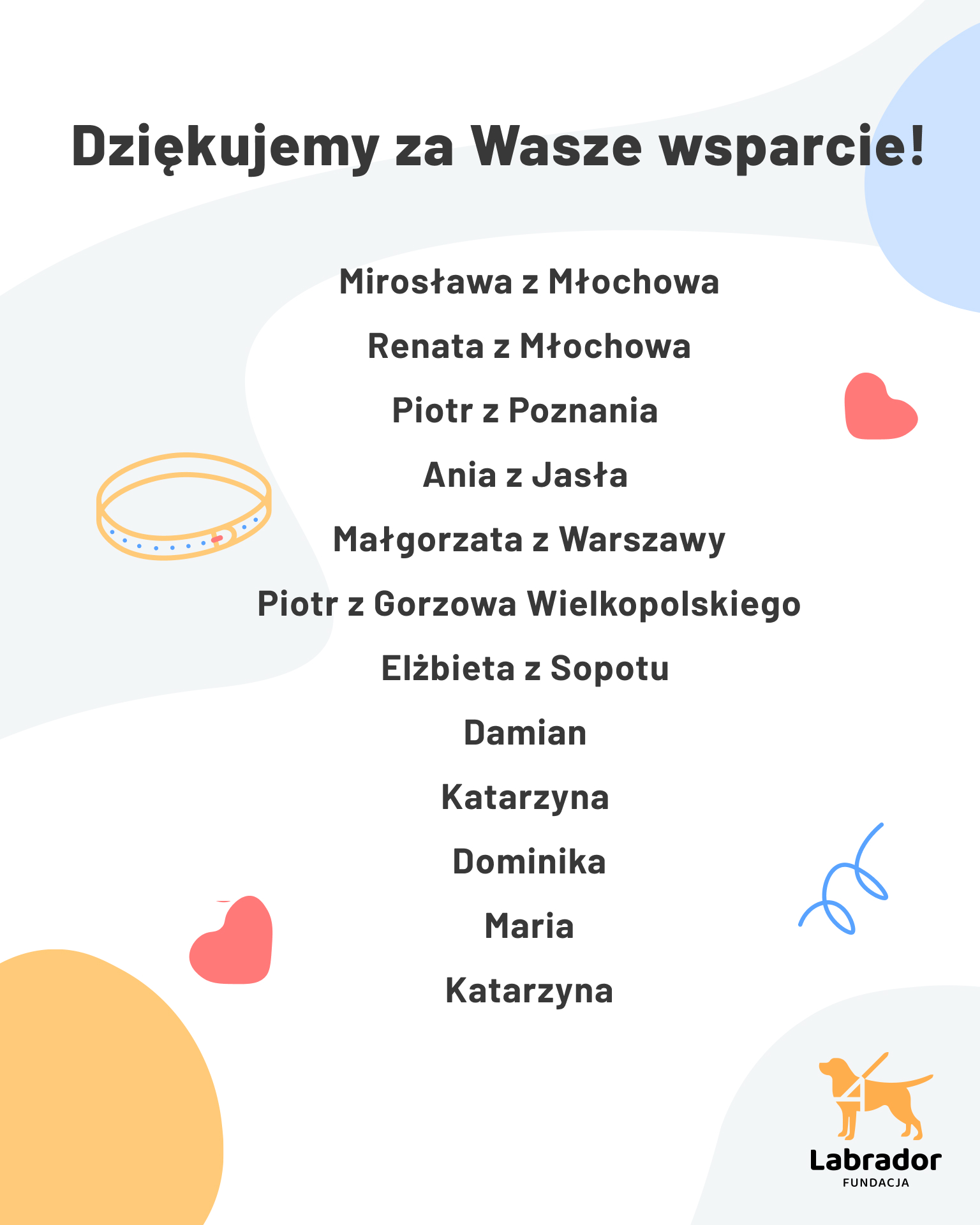 Serdeczne podziękowania dla Darczyńców, którzy w listopadzie przekazali nam darowiznę. Drodzy, szkolenie psów asystujących i bezpłatne przekazywanie ich osobom z niepełnosprawnością jest możliwe także dzięki Wam. Razem zmieniamy rzeczywistość osób z dysfunkcjami wzroku i zmagających się z zaburzeniami lękowymi, w tym szczególnie PTSD. Dzięki!