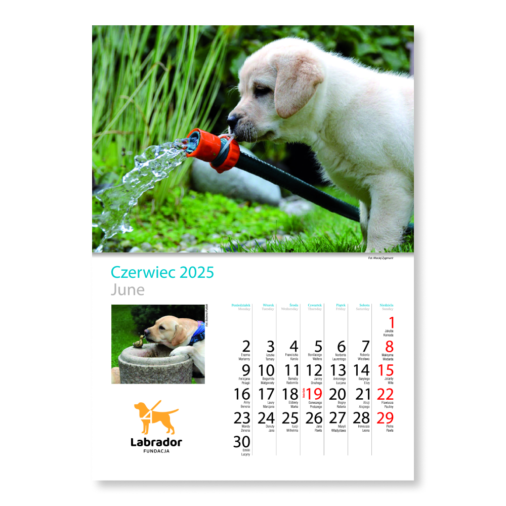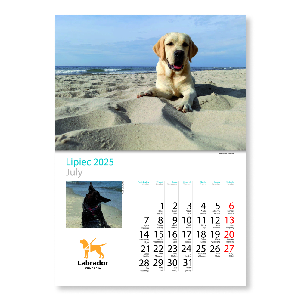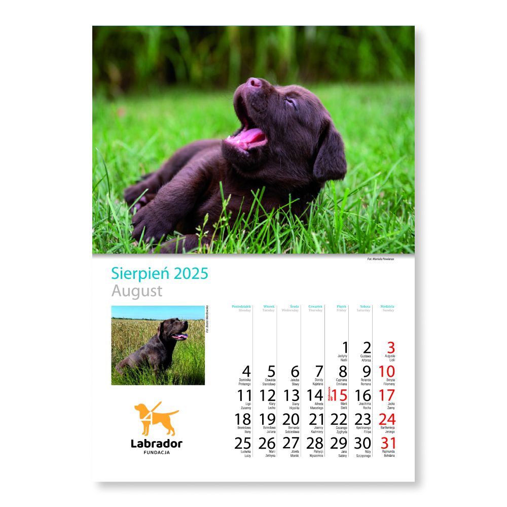 Kalendarz na 2025 rok zawiera kilkanaście unikalnych fotografii prezentujących Labradory wszelkiej maści – i te biszkoptowe, i te czekoladowe, i te czarne. Jesteśmy dumni z tego, że każdego roku w Państwa ręce trafia produkt oryginalny, z niepublikowanymi dotąd zdjęciami.