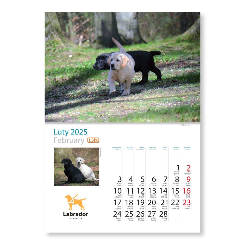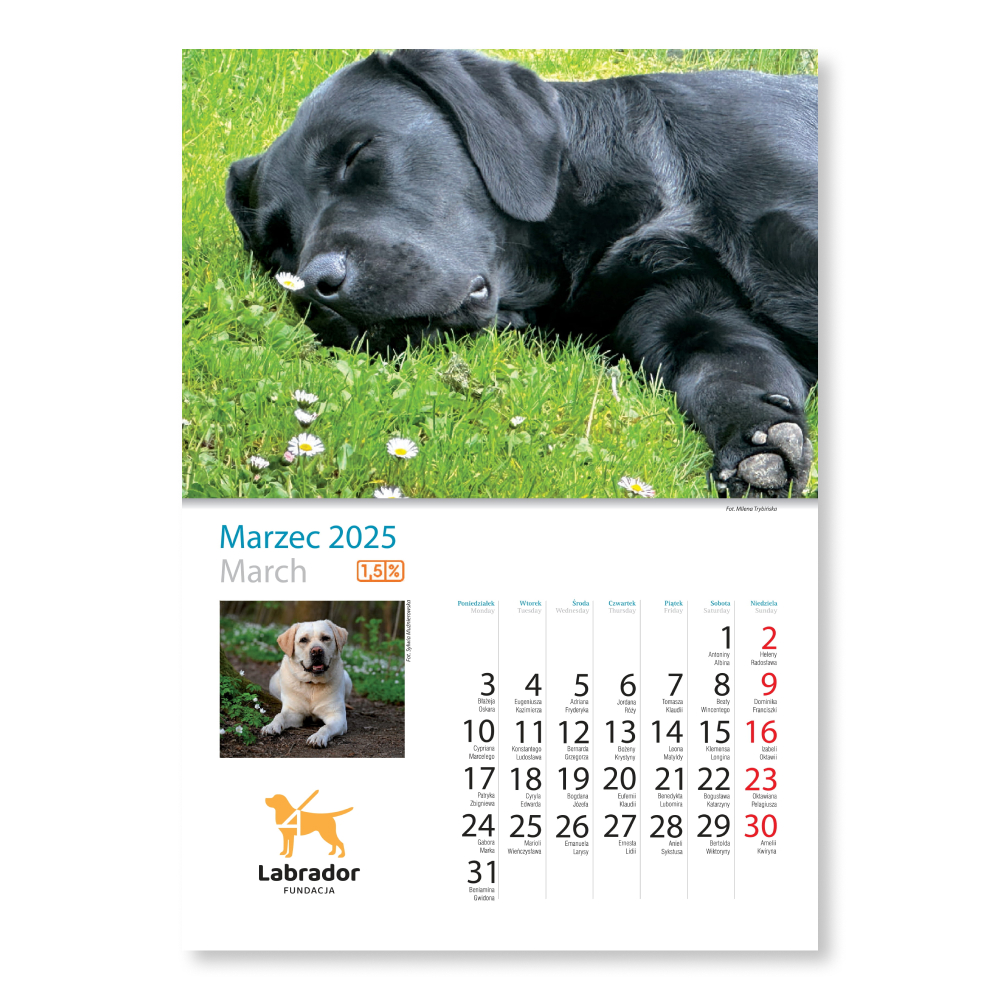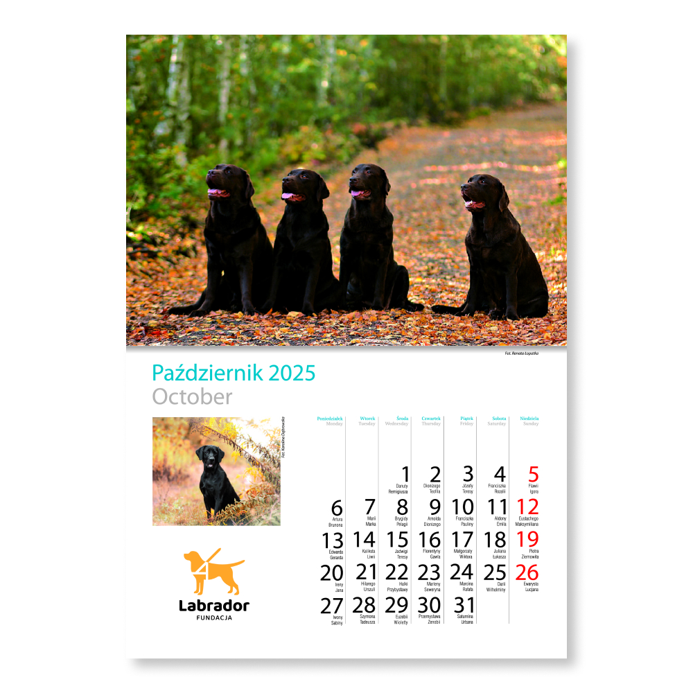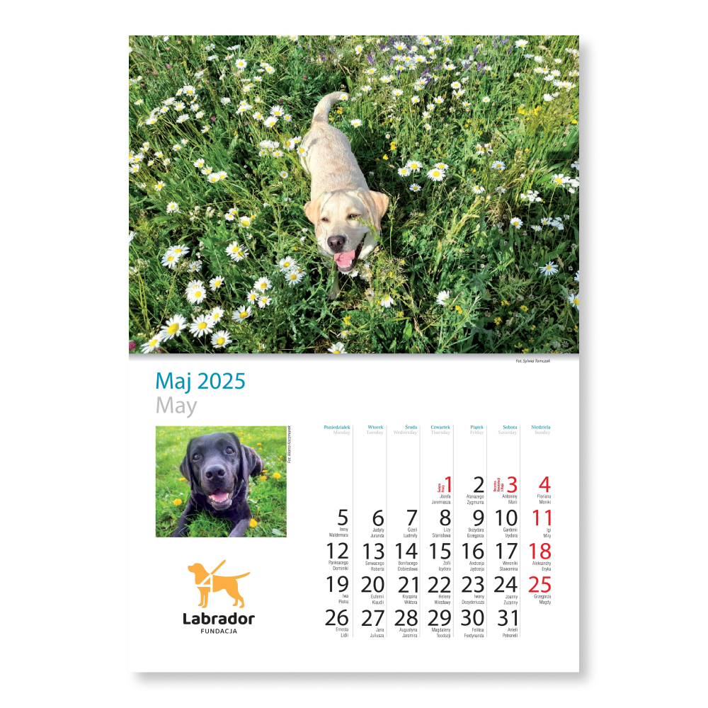 Kalendarz na 2025 rok zawiera kilkanaście unikalnych fotografii prezentujących Labradory wszelkiej maści – i te biszkoptowe, i te czekoladowe, i te czarne. Jesteśmy dumni z tego, że każdego roku w Państwa ręce trafia produkt oryginalny, z niepublikowanymi dotąd zdjęciami.