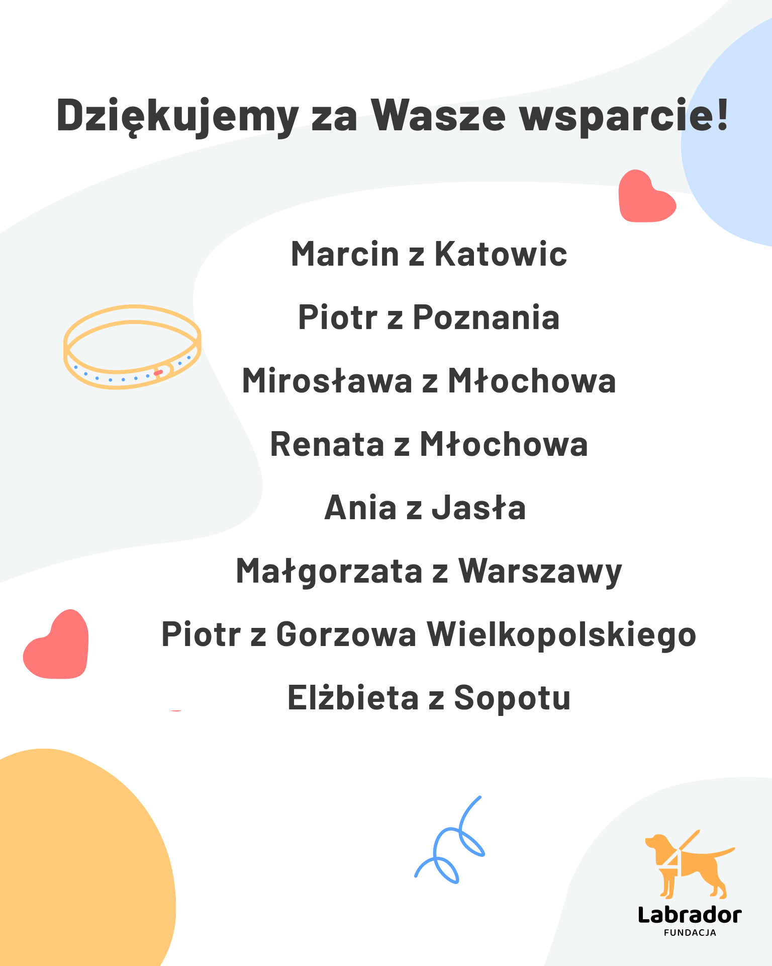 A oto nasi Darczyńcy, którzy pomagają nam szkolić i bezpłatnie przekazywać osobom z niepełnosprawnością psy przewodniki i psy asystujące.